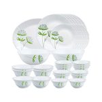 Larah By Borosil Green Lily Opalware Dinner Set, 33-Pieces, White